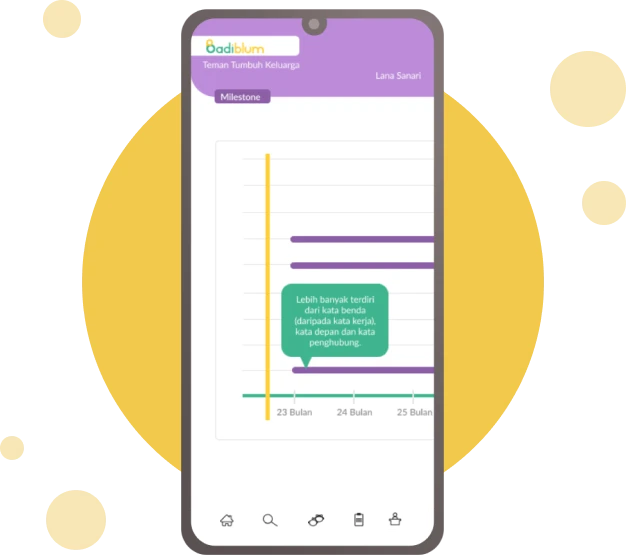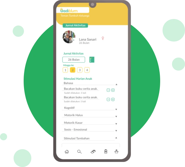 Menampilkan ragam aktivitas stimulasi perkembangan anak dalam bentuk jurnal kegiatan yang terpantau, Badiblum menghadirkan fitur Jurnal Aktivitas. Setiap aktivitas stimulasi perkembangan disajikan untuk dapat ditandai oleh Teman Tumbuh sehingga setiap stimulasi yang diberikan kepada anak dapat terekam. Jurnal aktivitas menemani Teman Tumbuh untuk dapat melihat perjalanan aktivitas anak dan merencanakannya sebagai usaha untuk terus mendampingi tumbuh kembangnya. Mari rencanakan dan rekam aktivitas yang dilakukan bersama anak untuk menjadi teman tumbuhnya dalam setiap tahap perkembangan!